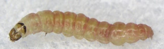 トマトキバガとは、南米発生のキバガ科に属する夜行性の蛾の一種で、トマトやピーマンのナス科の作物やインゲンなどの果実や茎を食害します。幼虫は体長0.9mm~7.5㎜ほどになり色はクリーム色、緑色、ピンク色と変化し、頭の後ろに黒い線があるのが特徴です。成虫は5㎜~7㎜と小型で褐色の翅に薄い黒斑があります。