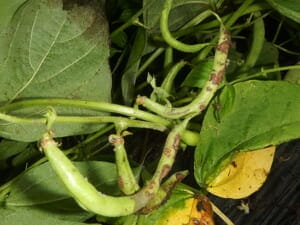 炭疽病は、葉や茎だけでなく莢(さや)にも発生します。発生初期の症状は、赤色斑点病に似ており下葉に2〜3mm程度の褐色の丸い円形の斑点が生じて、上葉に広がっていきます。被害が進むと、斑点の中心部は灰褐色となり、病斑が結合して大きくなり、茎にも広がり枯死します。