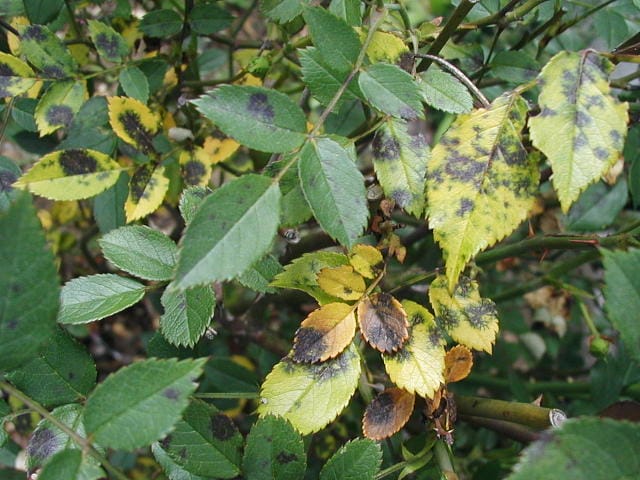 黒星病(くろほしびょう)は、古くから露地栽培のバラに発生しやすい病気で、カビ(糸状菌)の一種が原因で、黒点病(こくてんびょう)ともよばれます。