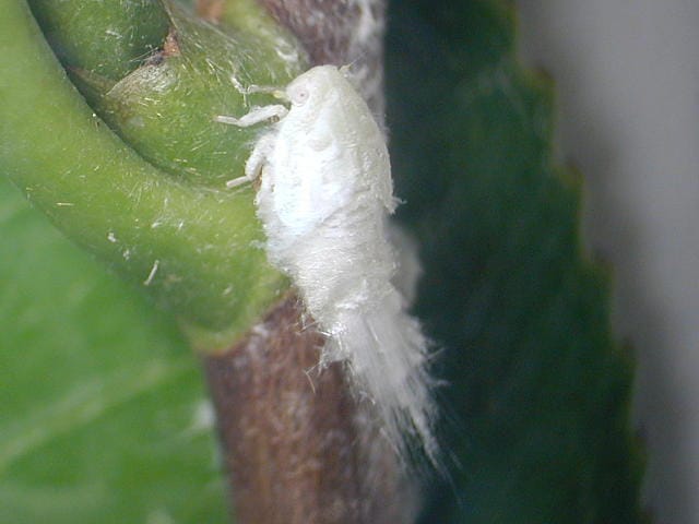 卵で越冬し、5月上旬ごろから幼虫が発生します。幼虫は触ると素早く跳ねて逃げます。7月~8月頃には成虫が枝にならんで吸汁します。それほど大きな被害はありませんが、幼虫から落ちた白い綿状の付着物質が新梢について汚れ見た目がわるくなります。