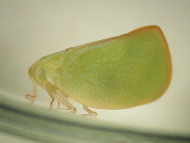 アオバハゴロモは、幼虫や成虫が植物の汁を吸って加害する昆虫です。幼虫は体長約10mm程度、体色は淡緑ですが、体全体に白い綿状のロウ物質でおおわれているため白色に見えます。成虫は体長6~8mm程度で、体色は淡青緑色で、縦に扁平な翅をもっています。