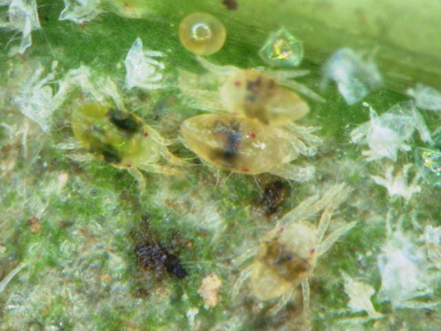 成幼虫が葉裏に寄生して吸汁し、葉表にカスリ状の白色の小さな斑点ができます。多発すると葉が小さくなったり、奇形、葉が落ちてしまうこともあります。また生育に影響を及ぼし花がつかなくなります。