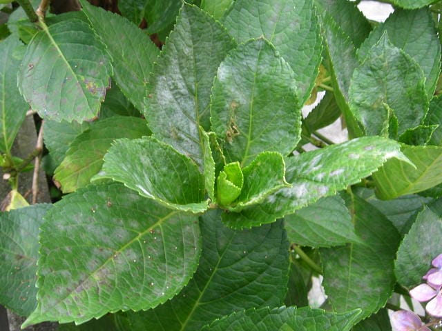 葉や花に感染が広がるアジサイのうどん粉病。落葉樹のアジサイは翌年は感染の危険性はないのでしょうか。うどん粉病の菌は、落葉した葉、枯れ葉、枯れ枝などに付着して寄生して土壌表面に残り、冬越をしをして翌年の発生減となることもあります。