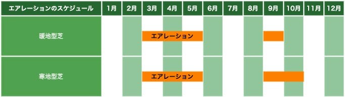厳密には、芝生の種類によって実施時期を変えると良いでしょう。基本的には、芝生の生長が旺盛になる3月〜5月頃にエアレーションをすると効果的です。