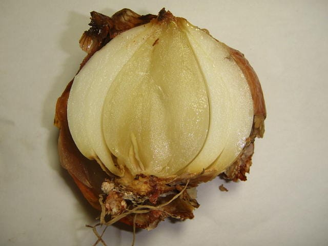 タマネギには定植後2か月ごろから発生します。発生初期は鱗茎の片側に病斑が現れるため、下葉が湾曲し黄色くなります。次第に葉が枯れ、りん茎の茎盤に白カビが生じ尻腐れ状態になります。乾腐病にり患した茎盤にはネダニが付着しているのも特徴です。