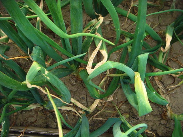 発生初期の症状は、葉の中央部分に青白色の病斑が広がり、次第に病床部が白色になって折れ曲がり先枯れ症状となります。苗の場合は、葉の先端が水浸状の濃緑色の斑点が現れ白色になり生気を失って立枯れ状態になります。