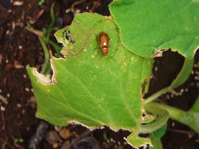 ウリハムシはハムシ科のカブトムシの仲間でウリバエとも呼ばれます。ウリハムシの名のとおりウリ科の作物を好み、成虫が葉や茎をを、幼虫が根を食害します。成虫は体長7~8mmで全体的に光沢のある橙黄色成虫です。成虫のの食跡は直径1cm~2cmの円形が特徴的です。