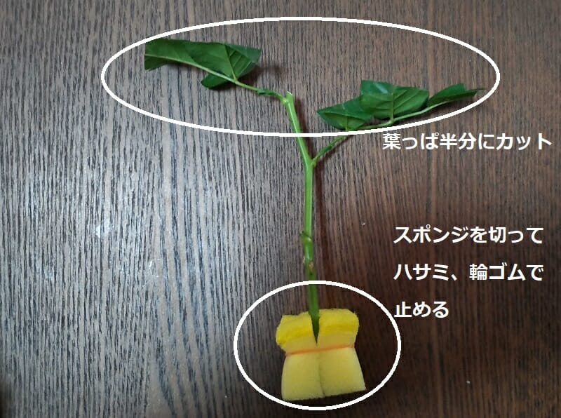 水揚げした枝を、スポンジを適当な大きさにきり枝を挟んで輪ゴムなどで止めます。発根促進剤のルートンを使う時には、この時に枝の切り口にメデールを塗ってから挟んでおきます。