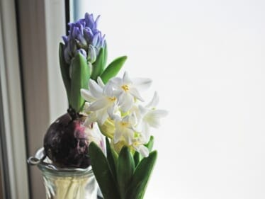ヒヤシンスの球根は、発芽するまでは寒い場所で、光を当てずに育てます。発芽をしたら日によく当てて育てるのがヒヤシンスの基本ですが、水栽培の場合、直射日光は容器内の水温が高くなりすぎる危険があるため、避けた方がよいでしょう。